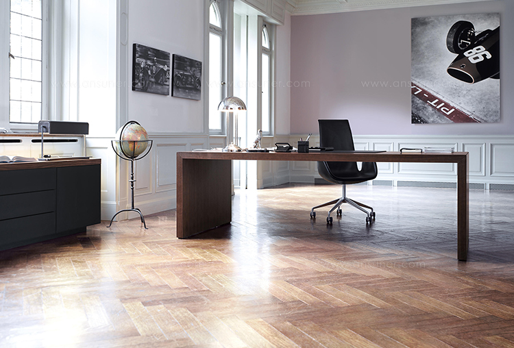 桌面和侧面,水平和垂直形成一个均匀的结构,是Headoffice Mono系列会议项目设计团队所执行的结构概念。强大的线条与精选材料的优雅相结合。由侧面和桌面所制成的直角,中间的桌子上有醒目皮革包裹的面板,如果有需要,可以使用滑动皮板来打开集成线路。电缆布线隐藏在桌面和副柜之间。
