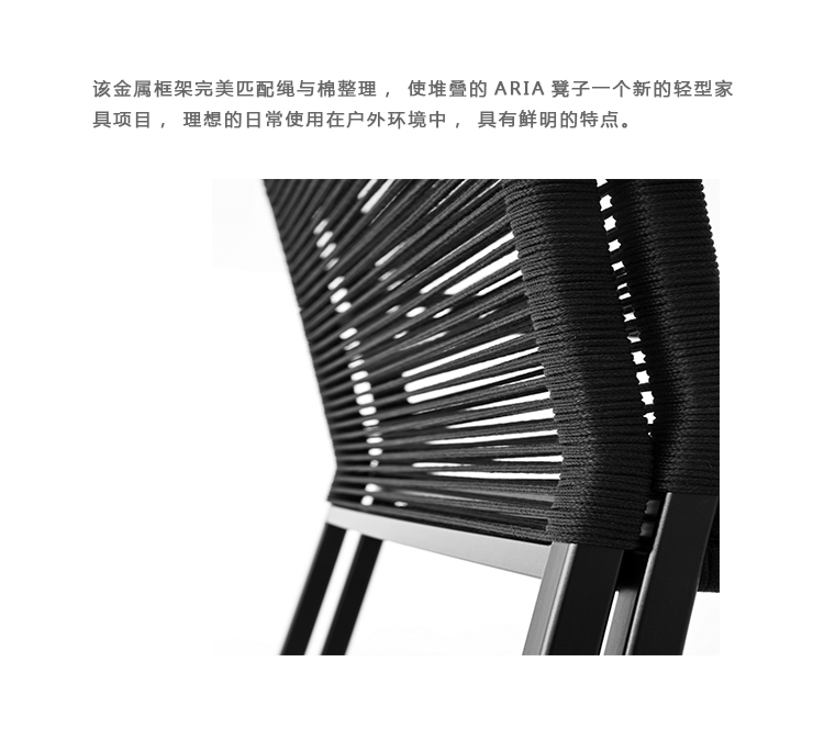 该金属框架完美匹配绳与棉质饰面,使堆叠的ARIA凳子一个新的轻型家具项目,理想的日常使用在户外环境中,具有鲜明的特点。