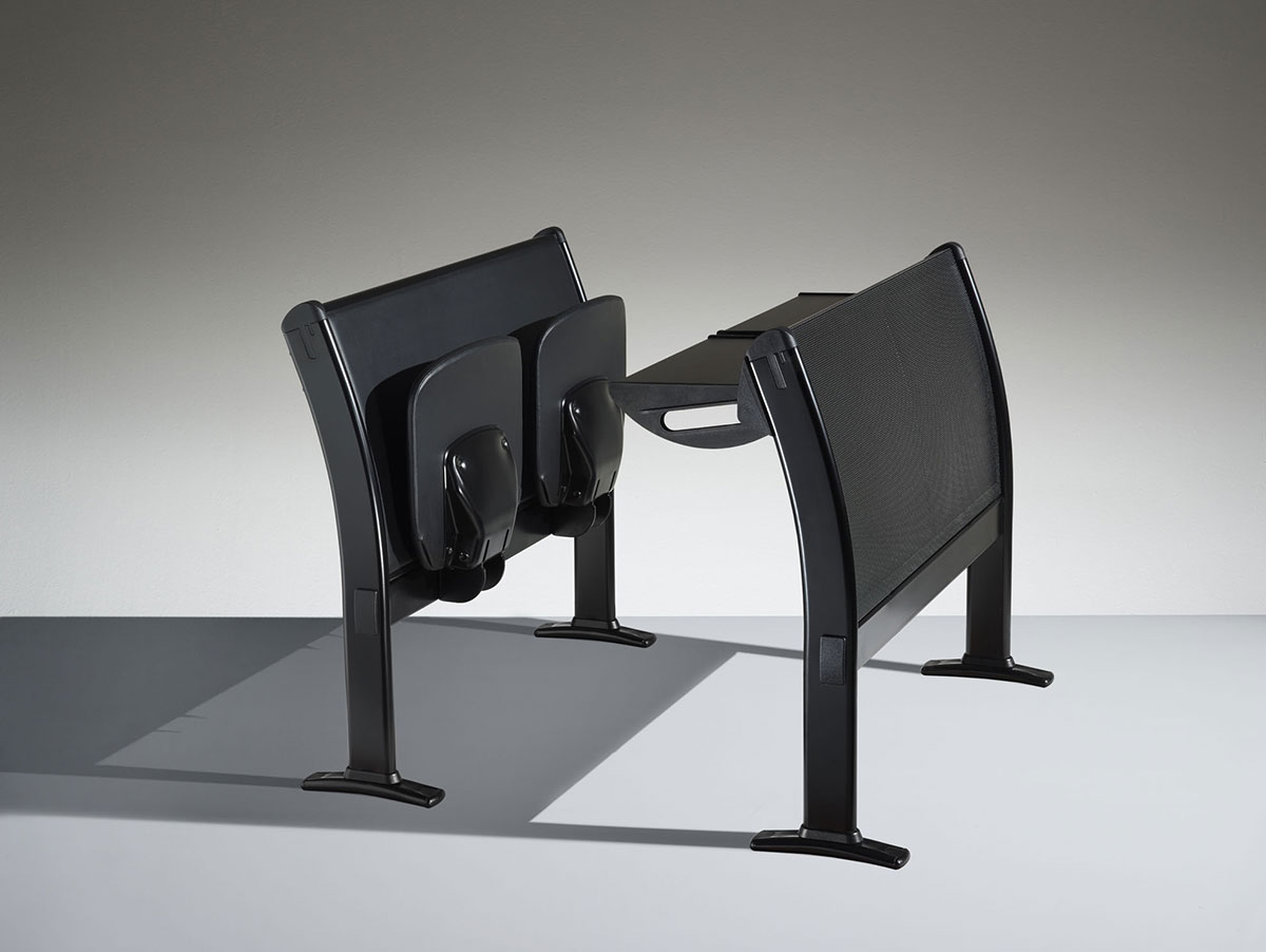 多功能的桌子和座椅系统,可放置两三个位置,直排模块化,非常适合大学,培训室或教学。特别注意结构的细节以及机芯的合理化,以确保较高的技术性能和抵抗力。该结构包括一个钢制地板支架,一个椭圆形的管脚以及一个由矩形管制成的水平连接梁,一个可用胶合板或模压板制成的连续靠背板。工作台由带ABS边缘的双层托盘组成,有固定版本,可折叠或带有防恐慌系统可伸缩。