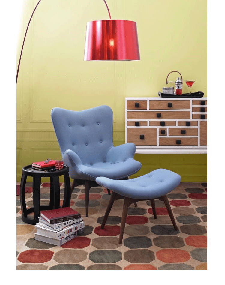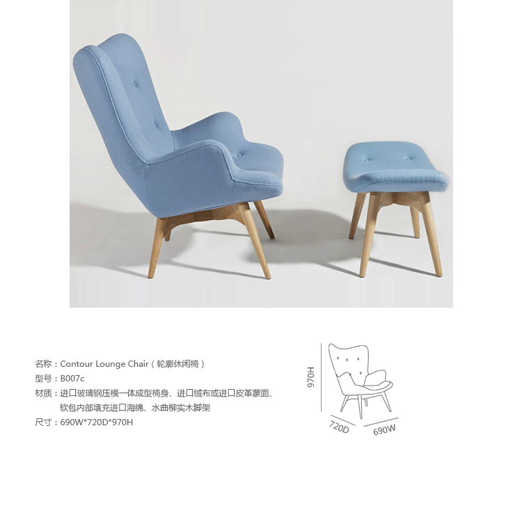 Contour系列家具由著名设计师Grant Featherston设计的,包括Contour Lounge Chair(轮廓休闲椅),Contour Lounge Ottoman(轮廓休闲脚踏)及其组合Contour Lounge Chair and Ottoman(轮廓休闲椅&脚踏)。Grant Featherston是澳洲设计界的灯塔,对许多澳洲设计师及家具控来说,Grant Featherston就是他们毕生的偶像。Contour系列家具有着花朵般的轮廓,工艺精湛榫楔结构的后倾脚座,细致钉扣从背靠延伸到坐面,超级舒适的包覆乘坐感,坐在其上面,真的就像是被捧在手心般的感觉。不论是乡村风、北欧风甚至是新古典低调奢华的家居风格,其都能像个公主般,优雅的点缀出您与众不同的品味。这把椅子经常被认为是澳大利亚家具设计的图标。灵感来自艺术与手工艺运动和包豪斯设计的极简主义的体现。