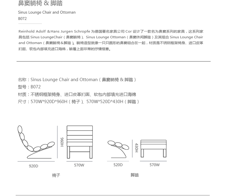 Reinhold Adolf & Hans Jurgen Schropfer为德国著名家具公司Cor设计了一款名为鼻窦系列的家具,这系列家具包括Sinus Lounge Chair(鼻窦躺椅)、Sinus Lounge Ottoman(鼻窦休闲脚踏)及其组合Sinus Lounge Chair and Ottoman(鼻窦躺椅&脚踏)。躺椅造型就像一只只圆形的鼻窦组合在一起,材质是不锈钢框架椅身、进口皮革扪面、软包内部填充进口海绵,躺着上面非常的抒情惬意。