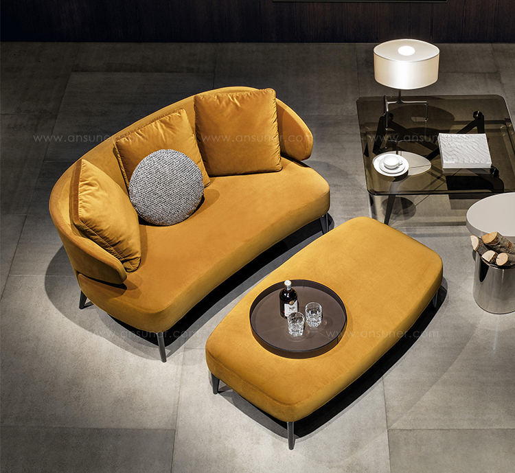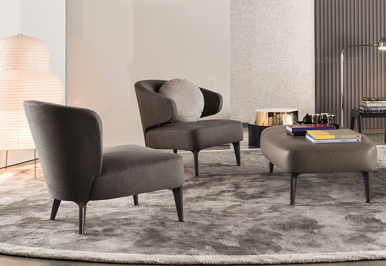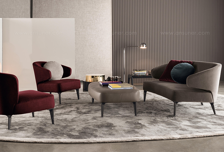 沙发的围裹式靠背特色十足,扶手线条与之完美呼应,以蓝灰色调呈现的压铸铝合金支脚尽展精致设计之美。