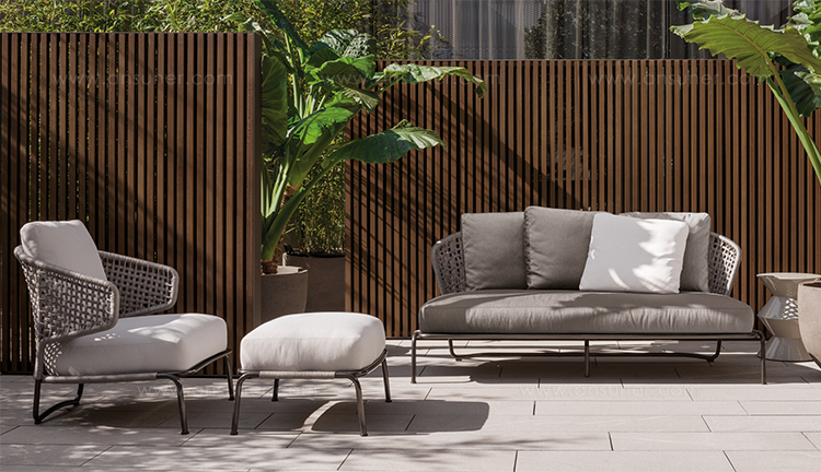 Aston是一个单品家族系列,其中包括沙发、沙发床、扶手椅、脚凳、座椅,为家居环境和“共享空间”提供优雅而时尚的装饰,在室内和室外皆可应对自如。阿斯顿“绳”户外系列采用金属材质的构架,搭配Pewter色聚酯漆面,部件都针对户外环境而经过特别处理,覆面采用疏水性纤维面料。靠背采用直径为7毫米的特殊聚丙烯纱线编织而成,两种颜色可供选择:浅灰色和深棕色,与全新Art Lifescape 02系列的面料和Alison “Dark Brown”户外系列的色调相得益彰。针对户外环境的特点,金属构架经过特别处理,搭配Pewter色聚酯漆面,覆面采用特殊聚丙烯纱线编织而成,有两种颜色可供选择:浅灰色和深棕色。坐垫采用Minotti Studio独家设计并通过激光加工而成的几何装饰。靠垫的内部填充物是高弹性聚氨酯泡沫,覆面采用疏水性纤维面料。