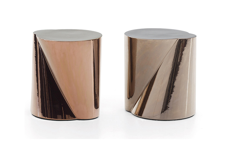 两个锥体连接在一起,打造出造型别具一格的边几,与此同时,两种金属饰面也体现出这款产品的非凡气质:铜色和铂金色。在经过玻璃化的工序之后,陶瓷还要经过进一步烧制,以此来熔化釉面的金属。