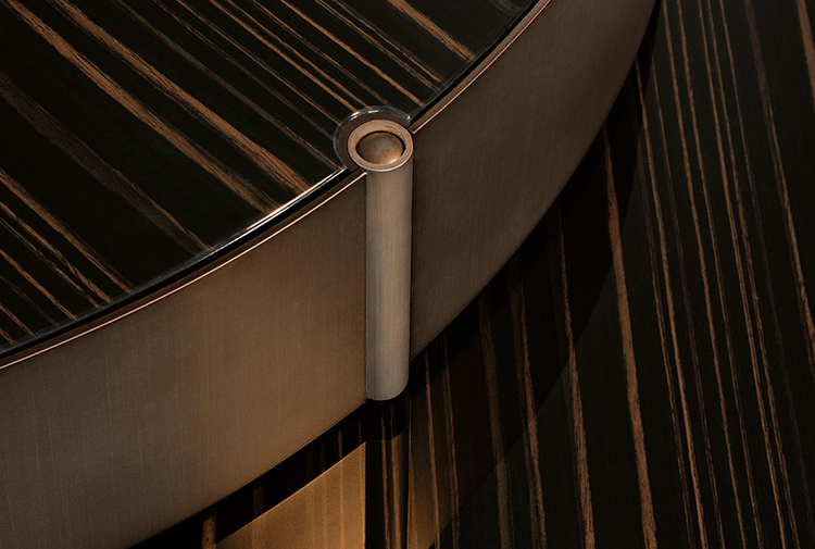重叠的造型搭配珍贵的材质,这就是Benson的独特之处。木材的质感和金属的光亮感完美展现出雕塑般的造型。Benson边几可以直接放置在地面上,有两种不同的尺寸可供选择,以满足不同的功能需求。尺寸为120x95厘米的版本,基座为椭圆形,上方面板为圆形,配备的机械装置可以使其旋转360度,增强边几的延展性,使其更加靠近沙发座椅。直径为46厘米,高度为38厘米的版本,专门用于放置在沙发和扶手椅的侧方,有以下组合可供选择:一种是下方台面为亮面乌木,上方台面为亚光铜色板材;另一种是下方台面为Moka色亮光漆,上方台面为金色亮光漆。