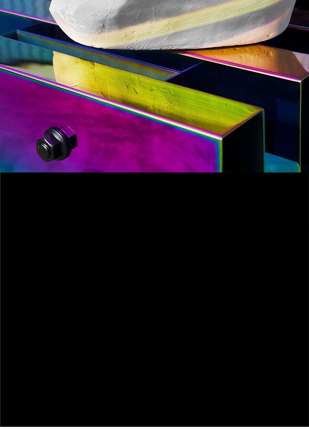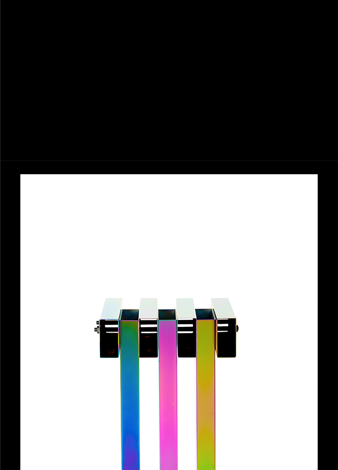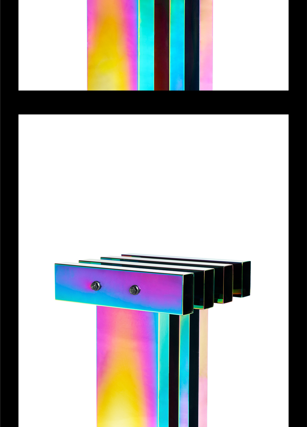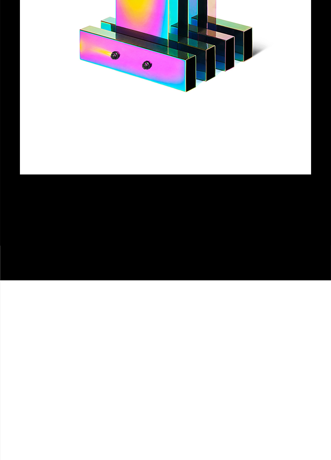 成熟常态的工艺完成规律性标准的矩形折面,与不可确定变幻成色的电镀技术,理性与非理性交集的不可控结果——不造,非常态。