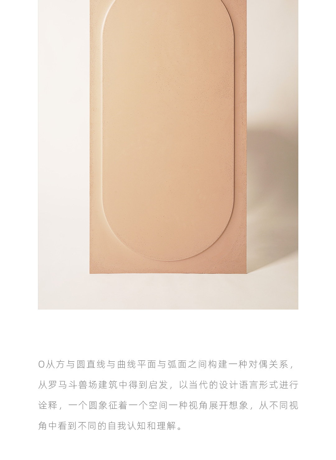 O从方与圆直线与曲线平面与弧面之间构建一种对偶关系,从罗马斗兽场建筑中得到启发,用当代的设计语言形式进行诠释,一个圆象征着一个空间一种视角展开想象,从不同视角中看到自我的认知和理解; 圆从方中向外凸起形成正负形的立体空间,从建筑室外走向室内,在空间中与声音空气阳光产生关系,有形和无形的交织富有装饰性和想象力;