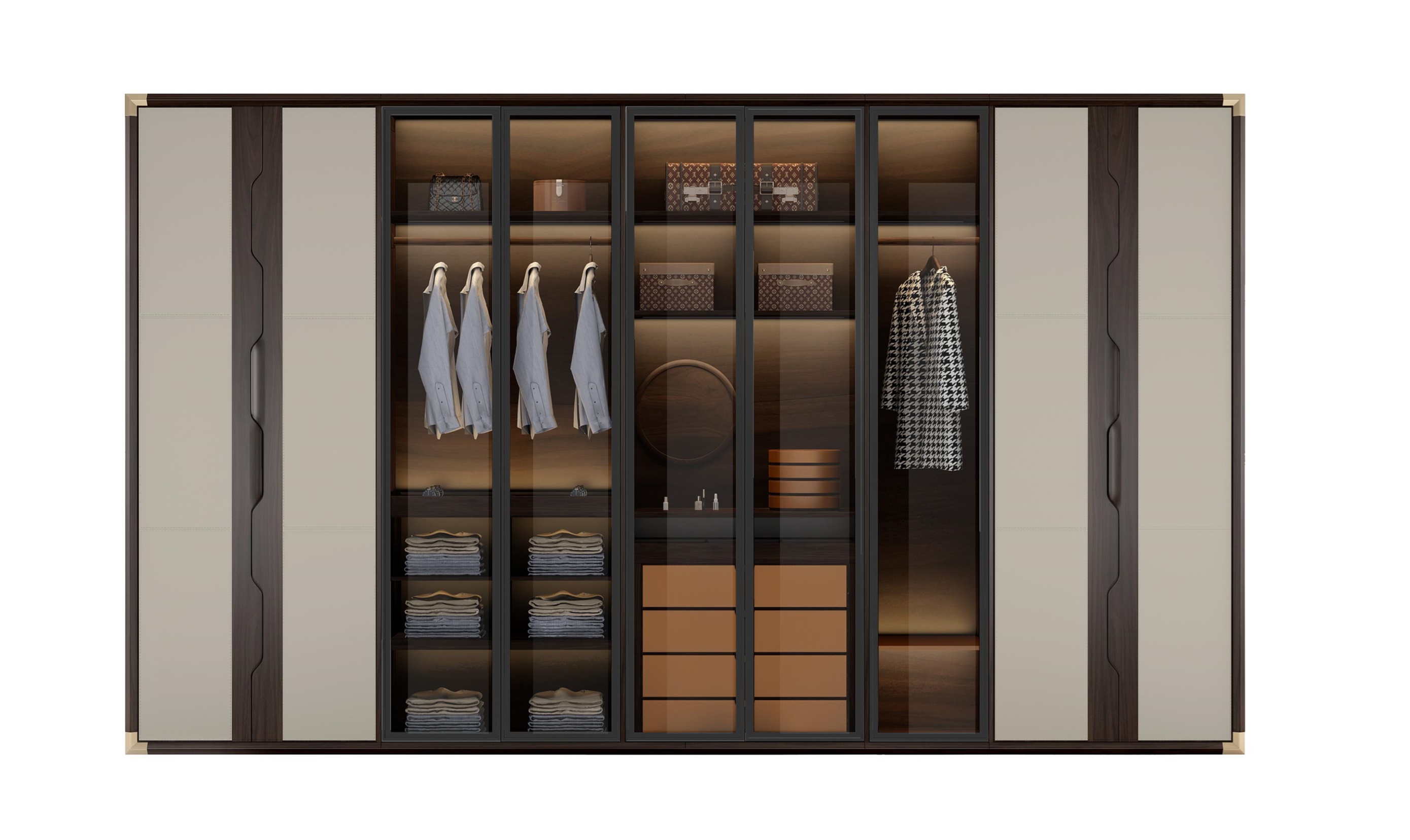 1.柜体采用嵌入式墙体设计,提高空间使用率,可定制。 2.半透明与封闭式门组合,同时功能分区明确,满足多种使用功能,便捷生活。 3.柜门拉手创意设计为连续榫卯造型,致敬经典,同时握感舒适。 4.橱柜四角装饰铜片,细节精致,质感十足。