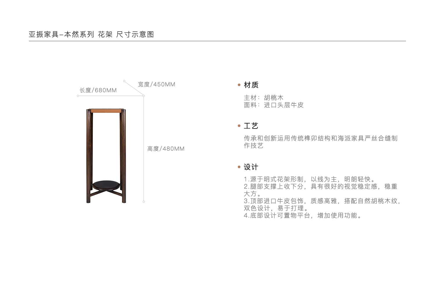 1.源于明式花架形制,以线为主,明朗轻快。 2.腿部支撑上收下分,具有很好的视觉稳定感,稳重大方。 3.顶部进口牛皮包饰,质感高雅,搭配自然胡桃木纹,双色设计,易于打理。 4.底部设计可置物平台,增加使用功能。