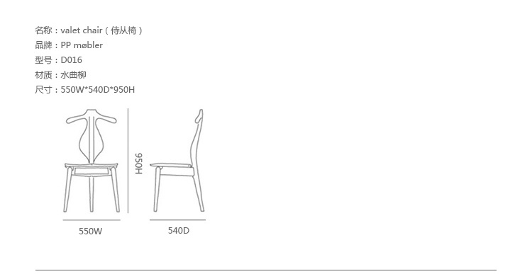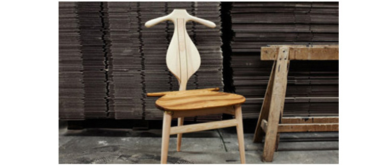 The Valet Chair(侍从椅),1953年设计,是Hans J. Wegner的经典代表作之一。这把椅子是Hans J. Wegner同建筑师 Steen Eiler Rasmussen 和设计师 Bo Bojesen 聊天谈到就寝时折叠衣服的麻烦,他就做了这个有趣的设计,为了让它看起来不笨重,从4条腿减到3条。靠背两侧选用对称的木纹,木纹的机理是整个靠背有机曲线的补充。椅子看起来像一把提琴,又像一个穿着燕尾服的侍从,不但具有美感,而且很具实用性。