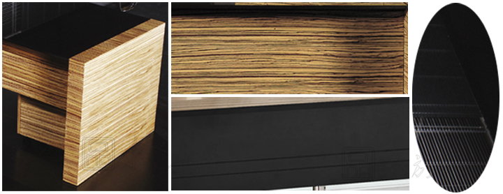 ※ 上图为大班台不同角度的展示,突出每个细节做工的精细,台面可以选做黑色烤漆钢化玻璃和中纤板实木面,斑马纹封闭漆,纹理漂亮而雅致,斑马纹非常亮眼,是很引人注目的室内设计元素,与黑色搭配更显现代潮流风格。