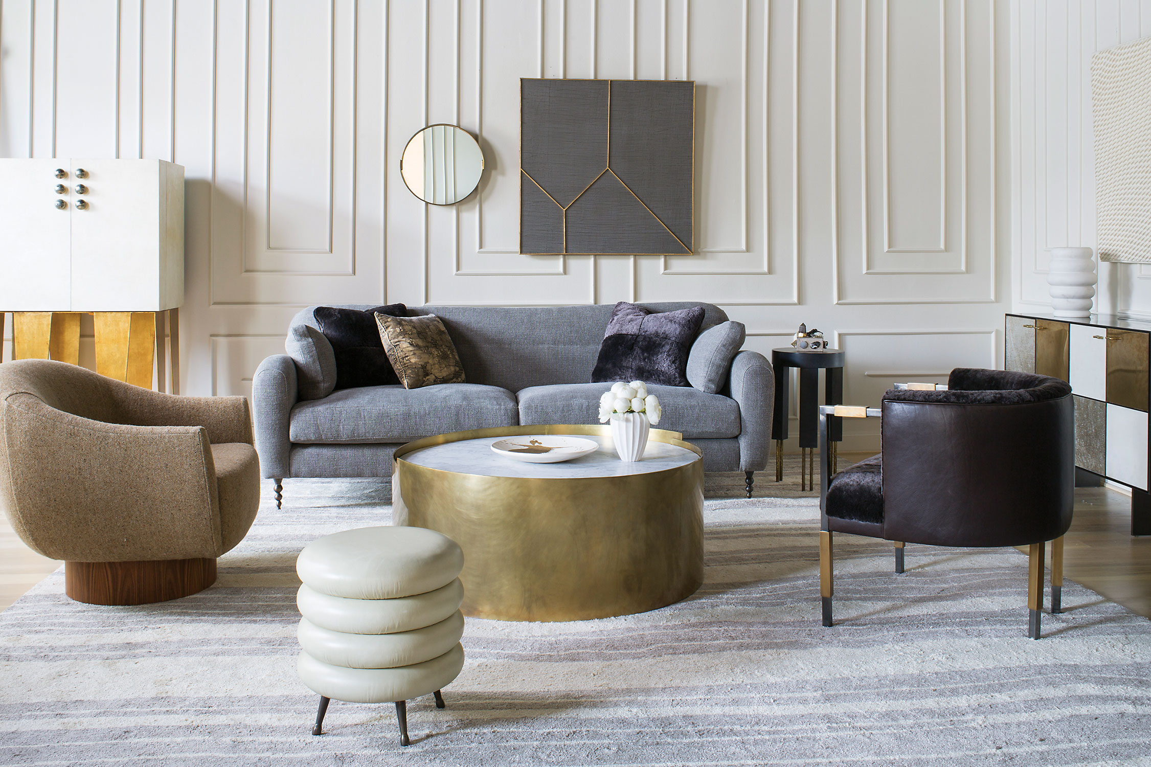 借鉴凯利对雕塑和原石的热爱,这款优雅精致的圆柱形实心鼓桌由一个1/4英寸黄铜板组成,表面饰有抛光青铜色,并在黑色或白色Marquina,磨光和密封的大理石顶部周围形成 Venatino石。 该设计具有微妙的重叠形状,为悄然标志性的轮廓增添了趣味和特色。