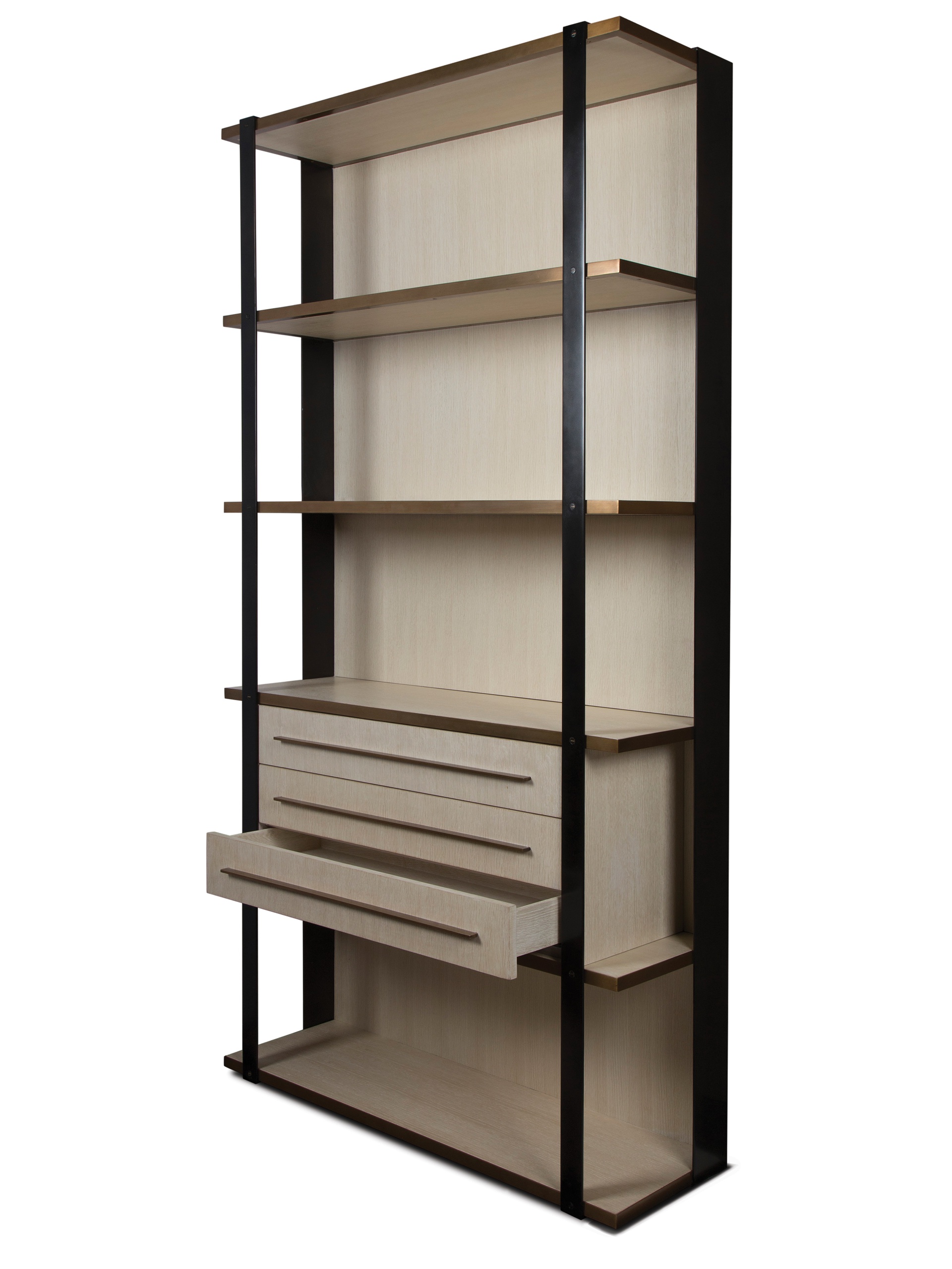 凭借Kelly对混合金属和材料并列的喜爱,富兰克林橱柜由黑色钢架,漂白的胡桃木制成,架子上饰有抛光青铜。 橱柜配有三个抽屉,四分之一英寸铣削青铜拉手,外观大胆,精致,现代。