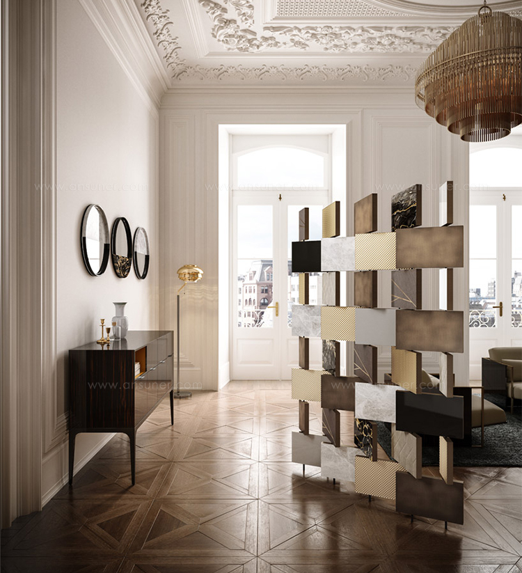 大理石、黄铜、石头、木头都是珍贵的镶嵌镶嵌物,揭开它神秘的面纱。帝国的屏幕展示了它强调材料价值的三维空间。石头上的雕刻,大理石光滑的表面,金属的滚花,木材的许多细微之处,与眼睛和触摸的交替和对比,给空间的装饰和空间的补充提供了绝对的区别。
