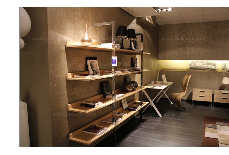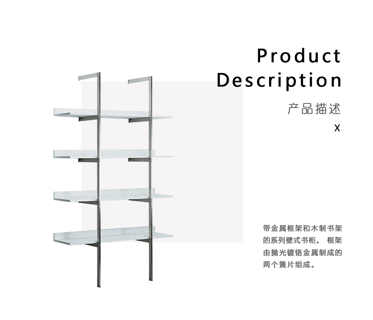 带金属框架和木制书架的系列壁式书柜。框架由抛光镀铬金属制成的两个簧片组成。架子可以是哑光或抛光漆器的所有颜色的集合:自然或温格染色橡木。书架也可以有不同颜色的书架。书架通过内六角螺钉固定在结构上,书架通过一个膨胀钩固定在墙上。