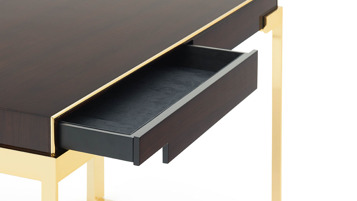 Dark, with glossy brushed finishing. Brass details coordinated with the frame