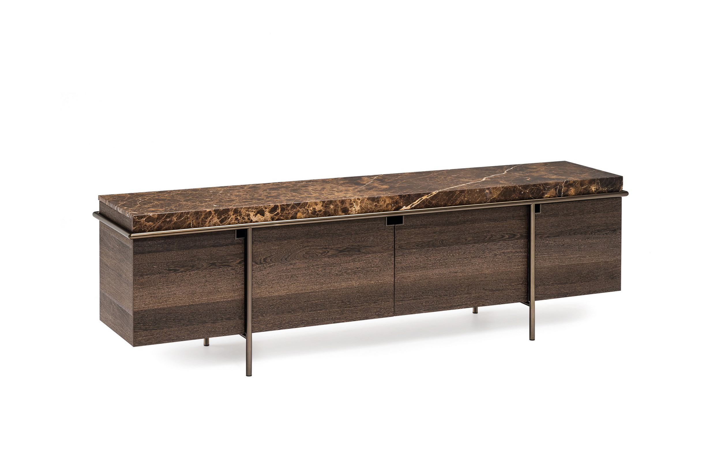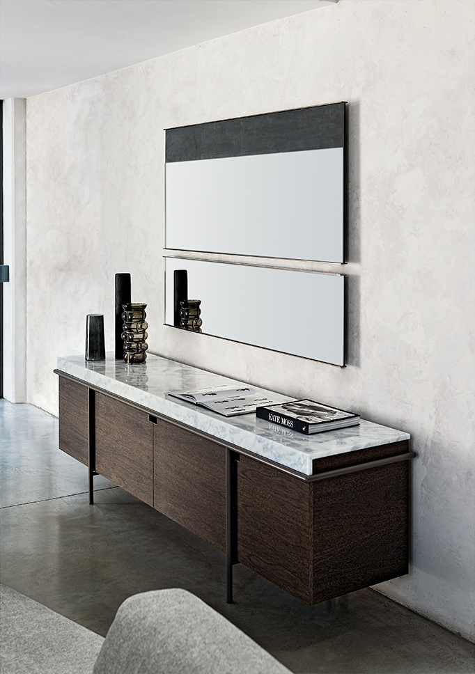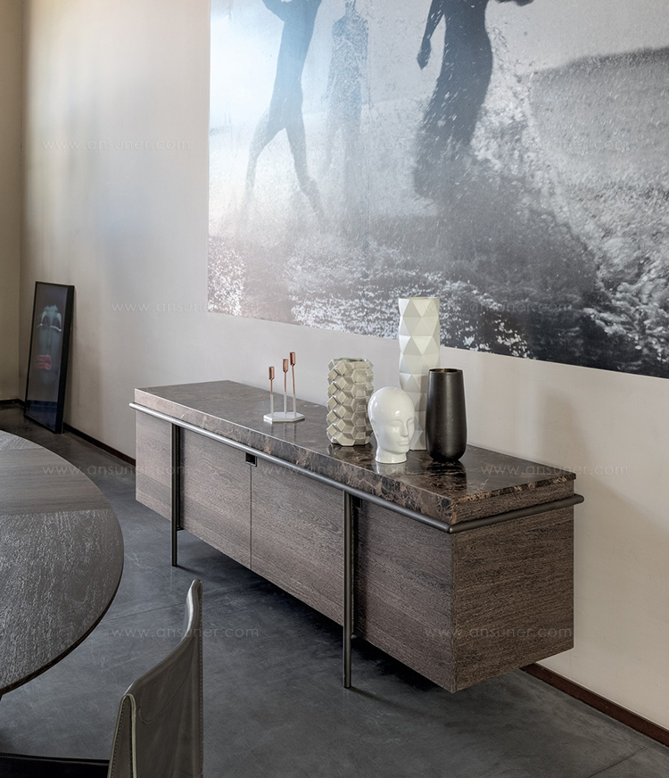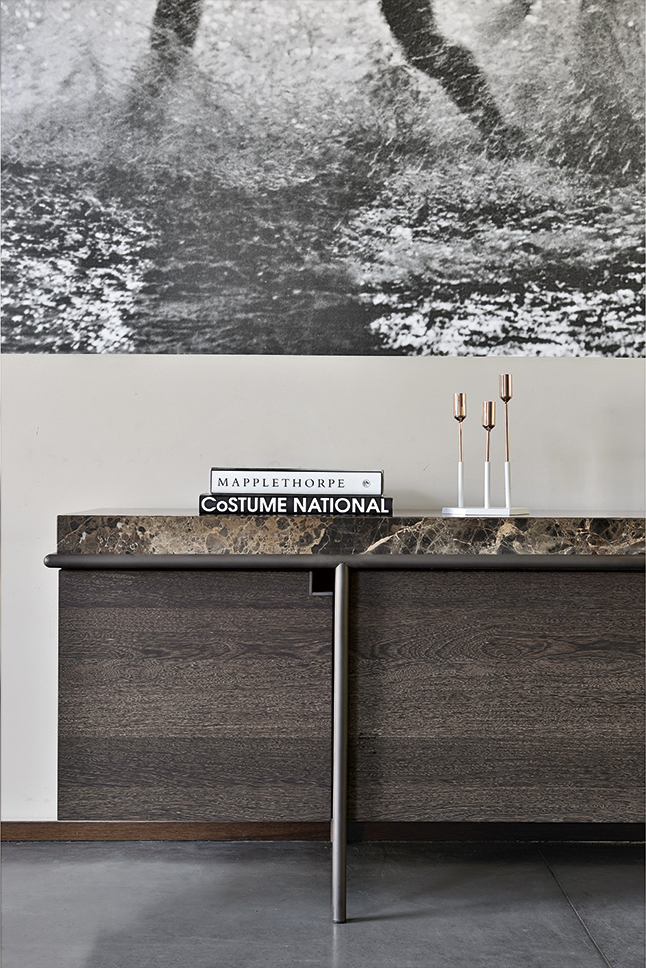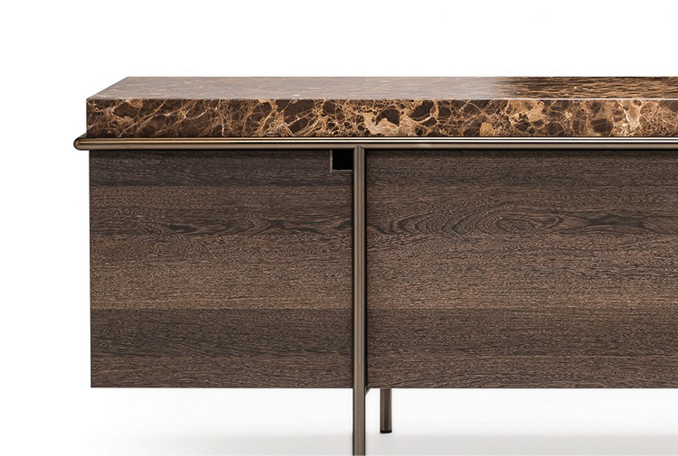 干净而严谨的外形特征是Aura餐具柜的特征。纯粹与几何灵感之间的相互作用是为了创造出一种具有独创性和优雅风格的设计作品。它的顶部是由大理石或蚀刻玻璃制成的,实木柜身漆成灰色或者棕色,由云母棕色、黄铜、钛或氧化灰色的金属管包裹。视觉效果是一个有着丰富而坚定的个性的形象。