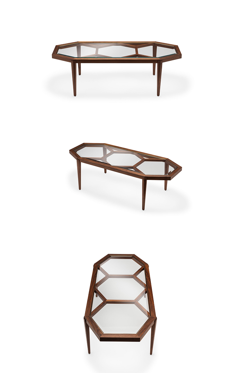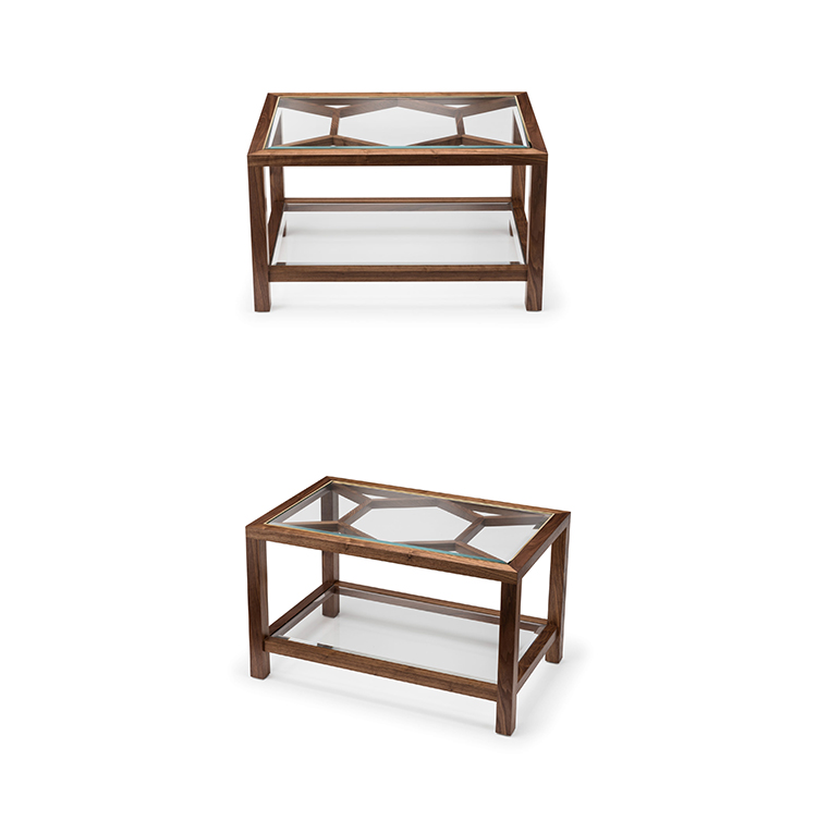 Expressing pattern beautifully, our Archebee Side Table is hand constructed of solid American black walnut and beveled glass with metal detailing. Its inherent strength and delicate form arises from where the beautiful rudiments of geometric form meet natural materials.