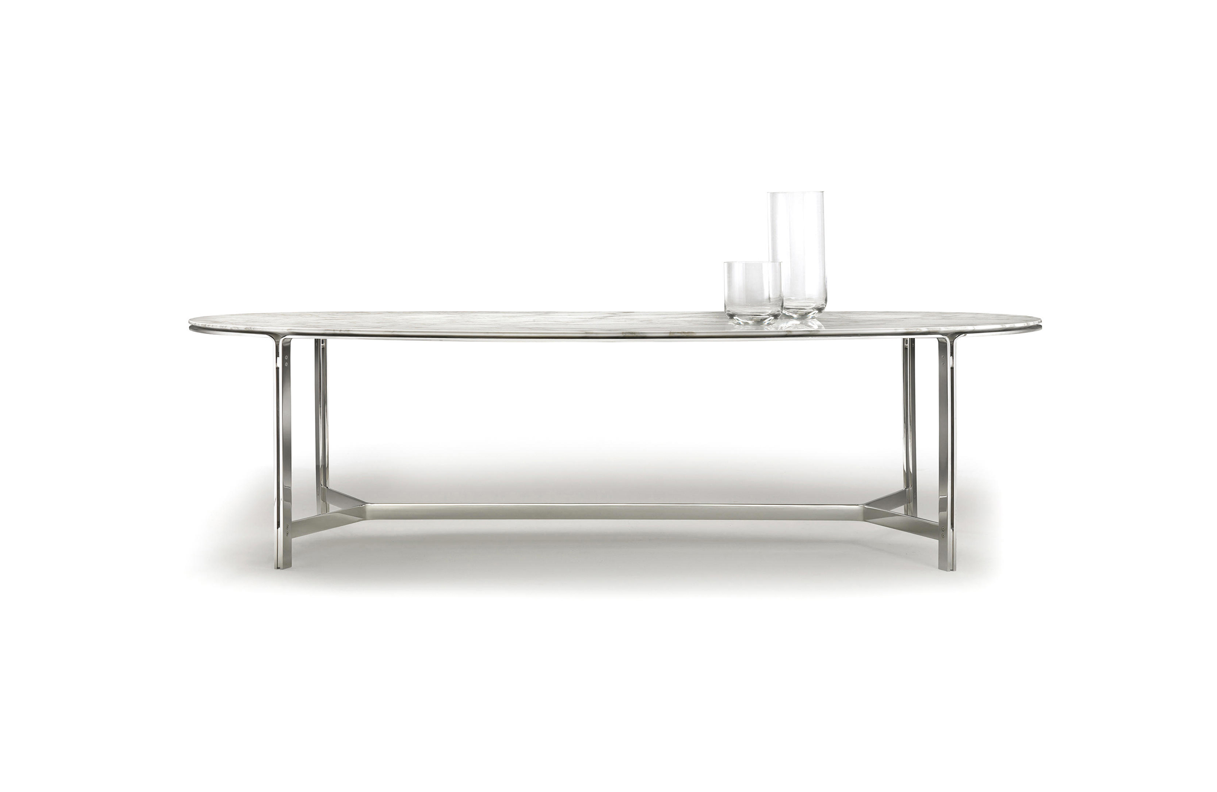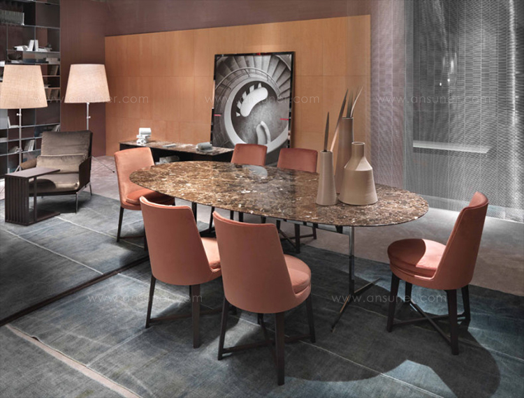 这是一张优雅的餐桌,也被解读成圆形的咖啡桌。CLARKE的金属结构是由腿部延伸到大理石或实木的桌面。桌面以一种不同寻常的椭圆形形式存在,同时保留坚定地结构。
