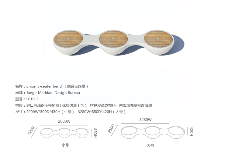 瑞典设计师Jangir Maddadi设计的这款联合座凳系列,可分为双座,三座及多坐,我司主要推出两座及三座,分别为:Union 2-seater Bench(联合双座凳)和Union 3-seater Bench(联合三座凳)。大家都知道,一般的座椅都是可以一个人或多个人一起坐,相互之间都不会受到影响。而这款连体休闲座椅却不同,外形很像一只陀螺,使用起来很像一个不倒翁,上面最多可以坐四个人。但是设计师并没有将这样的座椅让它们独立出现,而是用三张同样的座椅链接在一起,并且形成一个90度的直角,这样无论是陀螺还是不倒翁,都会很稳定的供给我们使用。当然,理论上来说,生产这种椅子,不仅可以做3件连体,4个,6个……都可以做。只是要考虑运输问题,或许3个是最完美的。这款连体休闲座椅不仅外形很优秀,而且还更加实用,使坐在上面的人有更多的空间,而且还可以保持面对面的互动。