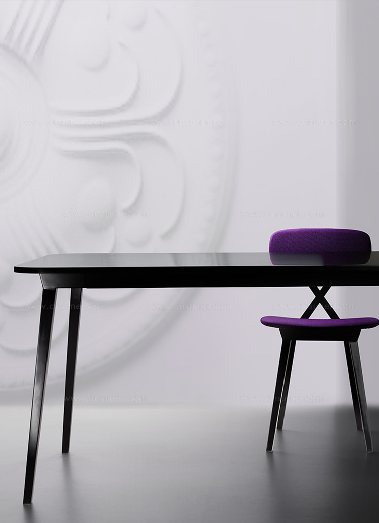 如果图形通常需要绝对黑色,设计师的目标是强调X在椅背的含义,其中没有其他线条干扰,但同时使其更具动感,座椅和背部装有软垫,面料色泽鲜艳,易于更换。 桌子是可伸展的,表面可以是木质的,也可以是单一材料的黑色塑料。
