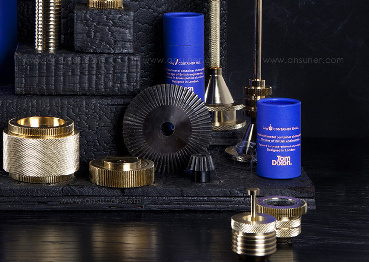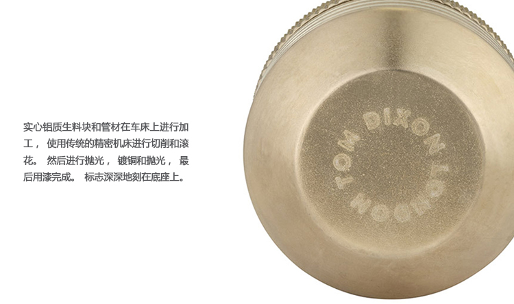 实心铝质生料块和管材在车床上进行加工,使用传统的精密机床进行切削和滚花。然后进行抛光,镀铜和抛光,最后用漆完成。标志深深地刻在底座