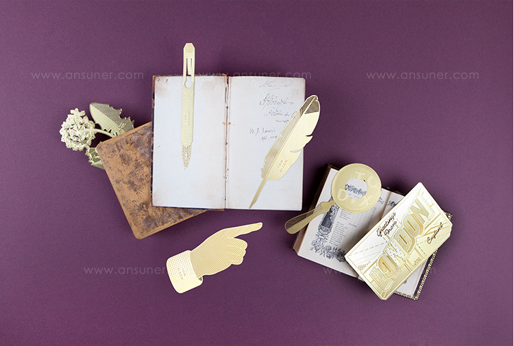 一个灵感来自大自然的书签和长期被遗忘的压花,往往落在一本备受喜爱的书的页面上。 工具蒲公英采用微观细节制造,从黄铜板精密蚀刻,创造出这种精致的花朵。 还有羽毛笔,钢笔,手形指针,明信片和放大镜。