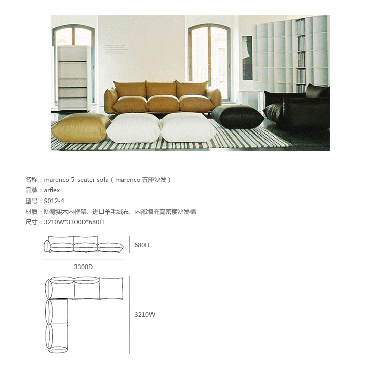 "marenco sofa系列沙发由设计师Mario Marenco在1971年所推出,Arflex公司出品,有单座,双座,三座,和五座组合形式。这款经典的沙发线条经典,舒适度饱满,成为摩登家居用品经典作之一。外型以简约细腻的北欧设计为方向,轻盈的金属脚架与薄型扶手,在厚薄粗细之间,视觉比例的层迭丰富,融合义式沙发中柔软舒适的元素,靠垫内衬高密度泡棉,兼具支撑性与松软度。这套沙发采用革命性的方式组合,垫子及扶手都是独立的部分。枕头是挤压钢管的金属框架,提供了刚性和耐用性。胶合板基地加上纤维覆盖。制作采用防霉实木内框架、进口羊毛绒布、内部填充高密度沙发棉,保证了高品质的奢华与舒适。