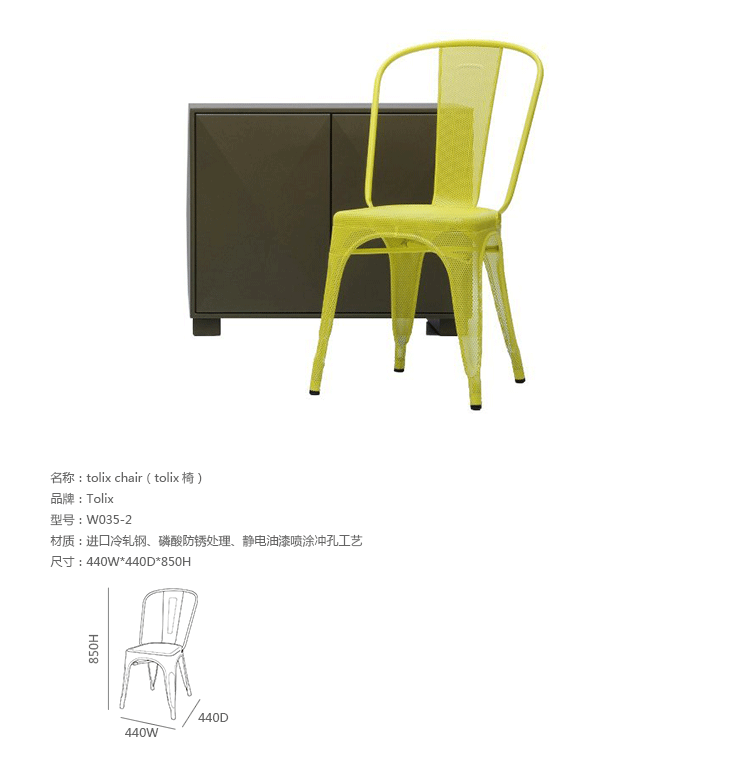 tolix chair(tolix椅)一把有味道、有态度的椅子,据说它最开始被使用在一艘战舰的天气预报房间里,故事的真实性与否不得而知,但是不影响其成为享誉世界的著名设计家具,1934年由Xavier Pauchard设计,早期是作为户外用家具设计,力图展现法式慵懒而闲适的气质,经年而来被全世界时尚设计师所宠爱,从室外扩展到家居、商业、展示等多个用途,而此椅也不负众望在各类空间中均有上佳表现,特别是近年来与混搭、乡村、美式、怀旧、北欧简约、中式等主要装修风格搭配,都呈现出独特的韵味,也被时尚界赞为“百搭第一”椅,可以用在酒吧,餐馆,咖啡馆等等地方,之后通过改进,设计出有扶手版本的tolix armchair(tolix扶手椅),高背版本的tolix high back bar stool(tolix高背吧凳),宽背版本的tolix wide back bar stool(tolix宽背吧凳),及tolix bar stool(tolix吧凳)和tolix mini stool(tolix迷你凳)。制作采用进口冷轧钢、磷酸防锈处理、静电油漆喷涂工艺、坐面为木板或PU海绵坐垫,颜色可选。