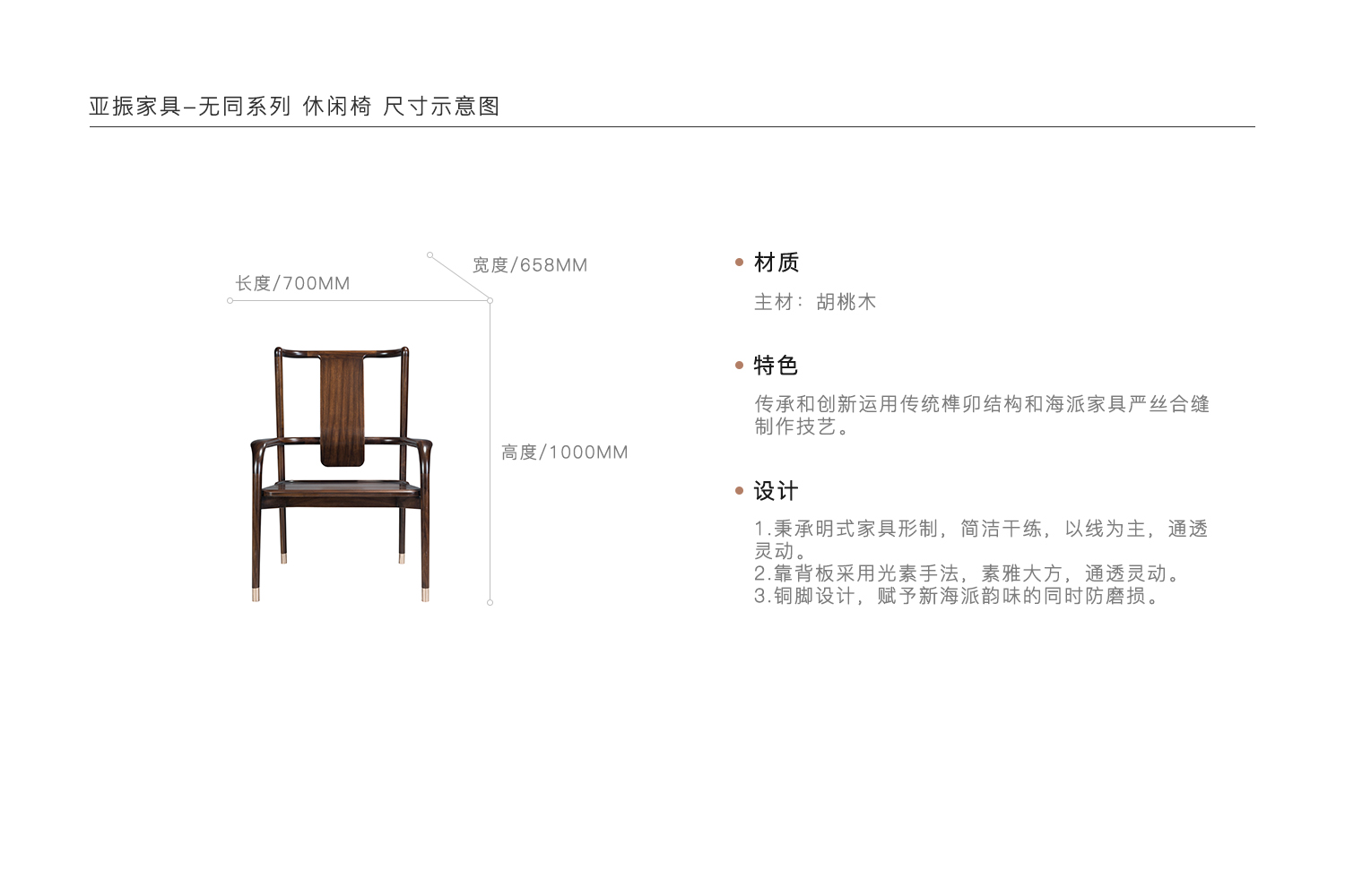 1.秉承明式家具形制,简洁干练,以线为主,通透灵动。 2.靠背板采用光素手法,素雅大方,通透灵动。 3.铜脚设计,赋予新海派韵味的同时防磨损。