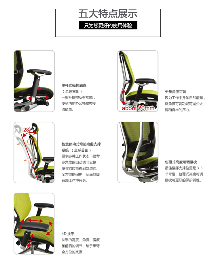 人性化背垫弯曲支撑系统,坐下时因个人体型需要自动改变椅背与腰部角度,聪明的移动,抓住你的背,提供最舒适的支撑