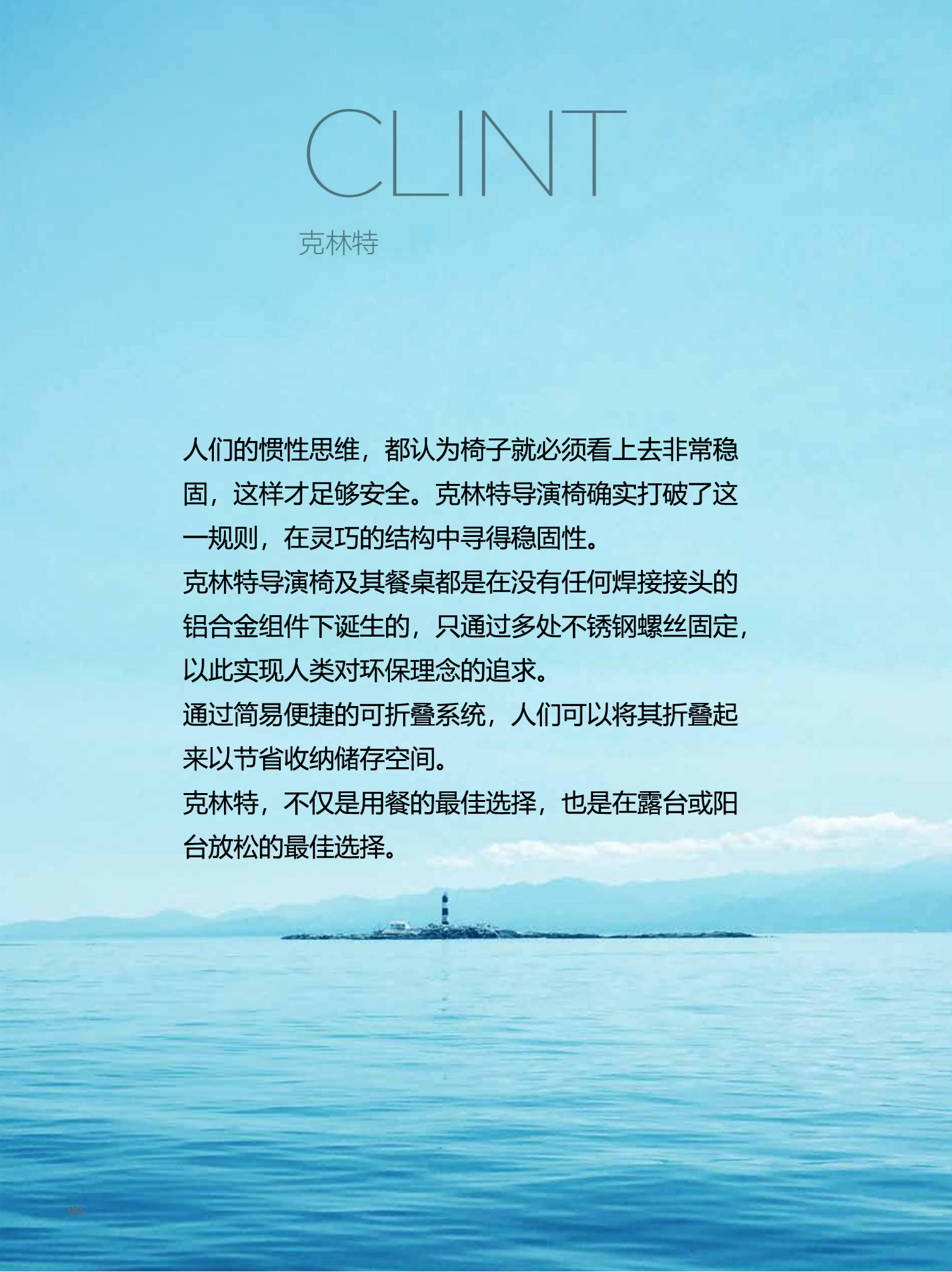 人们的惯性思维,都认为椅子就必须看上去非常稳固,这样才足够安全。克林特导演椅确实打破了这 一规则,在灵巧的结构中寻得稳固性。 克林特导演椅及其餐桌都是在没有任何焊接接头的铝合金组件下诞生的,只通过多处不锈钢螺丝固定, 以此实现人类对环保理念的追求。 通过简易便捷的可折叠系统,人们可以将其折叠起来以节省收纳储存空间。 克林特,不仅是用餐的最佳选择,也是在露台或阳台放松的最佳选择。 “新奇”---打破常规餐椅的稳固特性,在灵巧的结构中寻得独有的安全坐感 “纯粹”---航空级金属外框无任何焊接工艺,只通过多出304级不锈钢螺丝固定,突出环保理念 “轻便”---选材轻便,具备可折叠系统,以节省收纳储存空间 “随性”---适用于餐厅,露台,阳台,咖啡厅等多场景