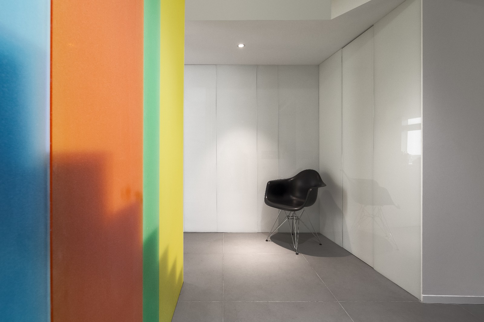 沿着转折的烤漆玻璃墙绕过楼梯,左边是紧靠大楼窗户的员工区,右侧轻推一块门洞大小的玻璃墙,原来样品间兼会议室藏于此处。隐藏设计功能区的目的是规避众多的样品布料给人凌乱无序的感觉,同时保证会议的绝对安静和不被干扰。