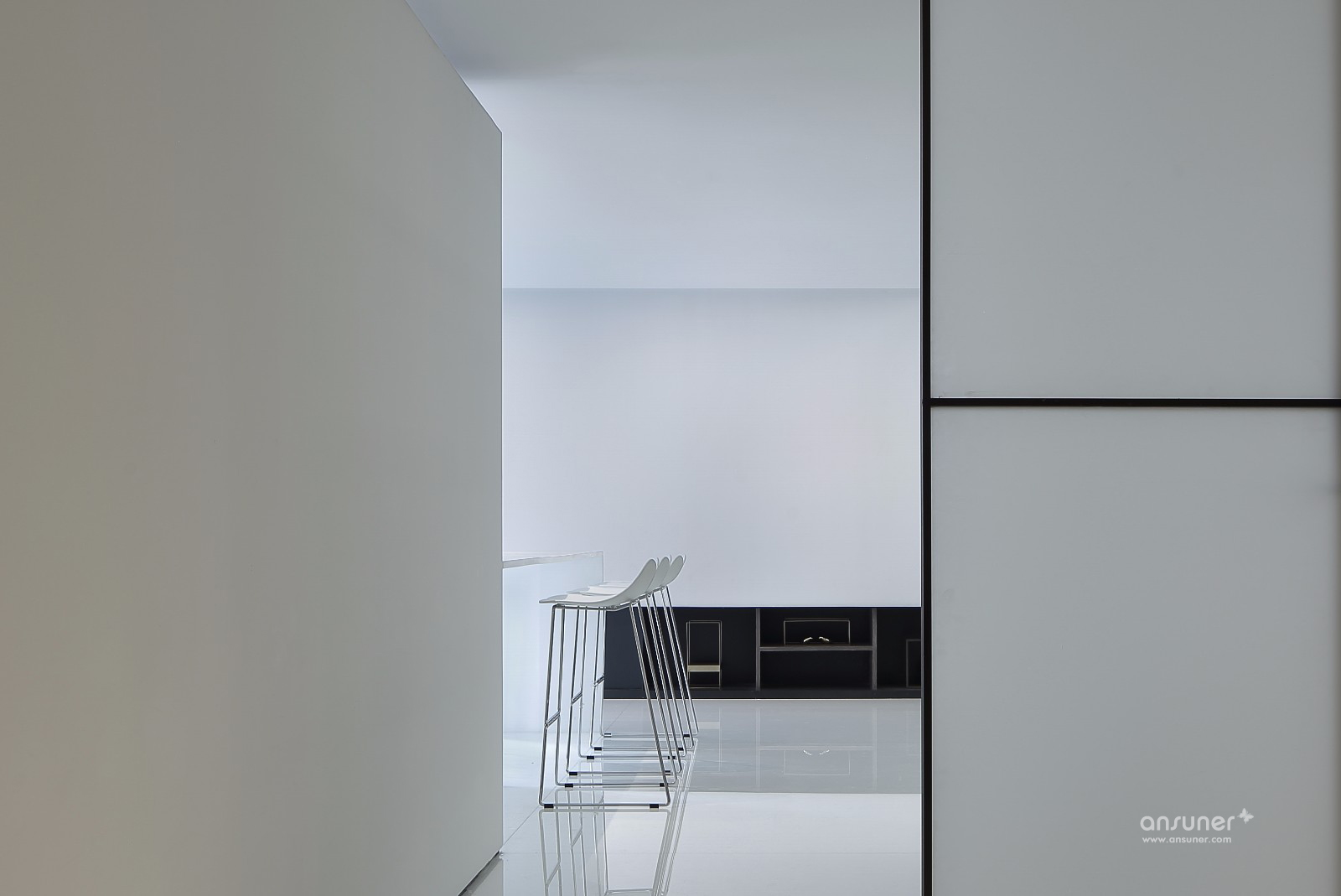 极简设计下,纯净的白色从顶面、墙面一直延伸到地面在单一色调中,以简明的线条,勾画出空间棱角。