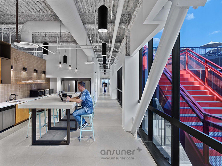 为了增强整体的社区凝聚感,每个楼层都围绕中庭建立一道环形公共走廊,并沿着走道布局一系列休闲会议空间、有趣的座位区,这样每位员工都可以从各个角度欣赏中庭美景。环形走廊让员工或访客在漫步于整个建筑时不会干扰到其他人的工作。